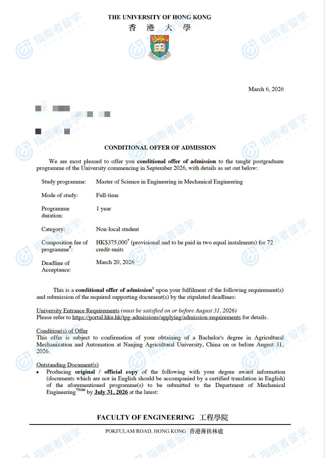 香港大学机械工程(工程)理学硕士研究生offer一枚