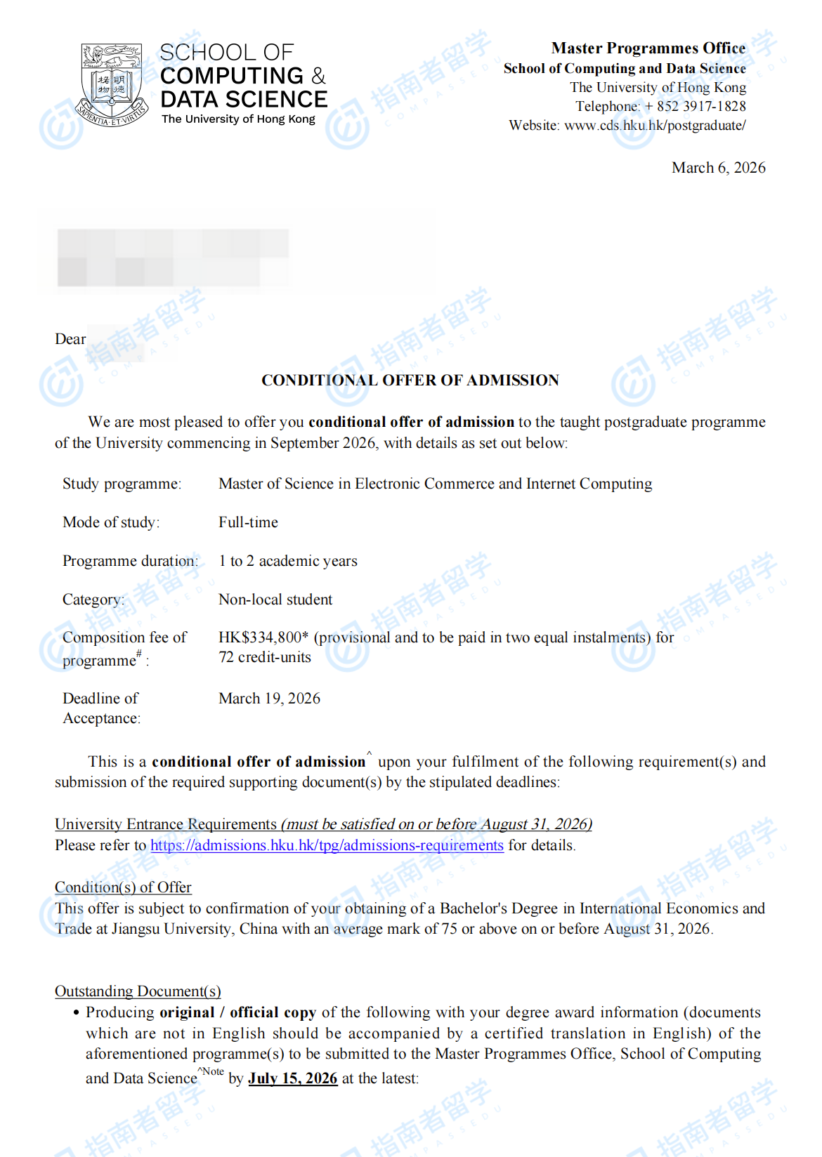 香港大学电子商贸及互联网工程理学硕士研究生offer一枚