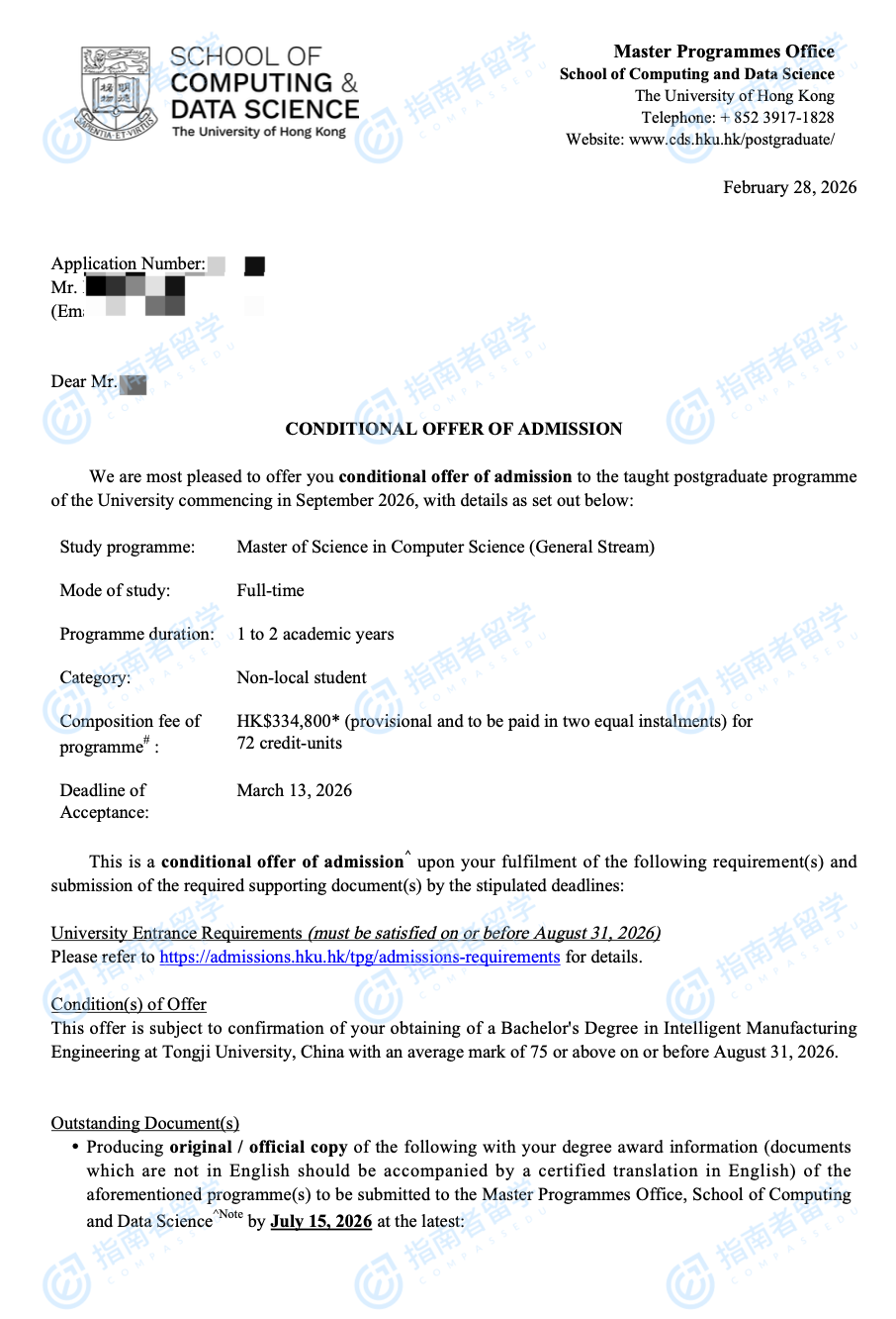 香港大学计算机科学理学硕士(常规方向)研究生offer一枚