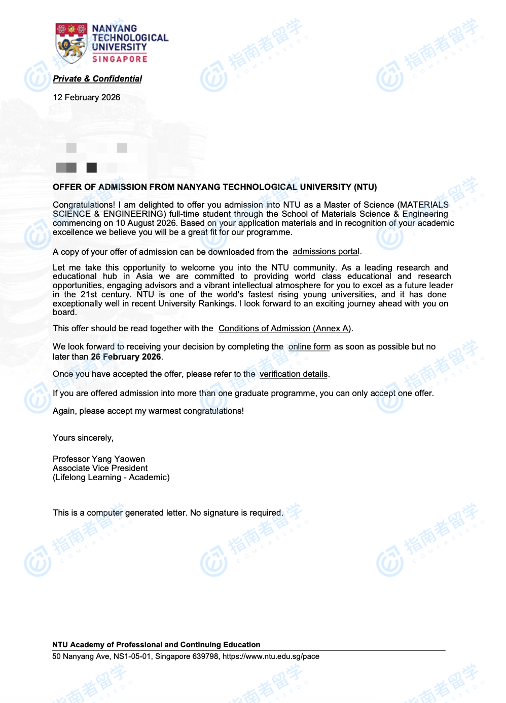 南洋理工大学材料科学与工程理学硕士研究生offer一枚