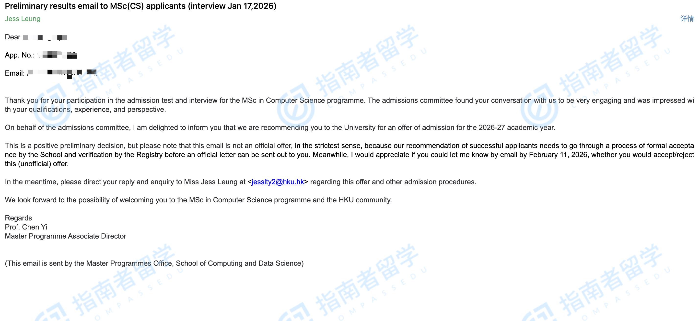香港大学计算机科学理学硕士(常规方向)研究生offer一枚