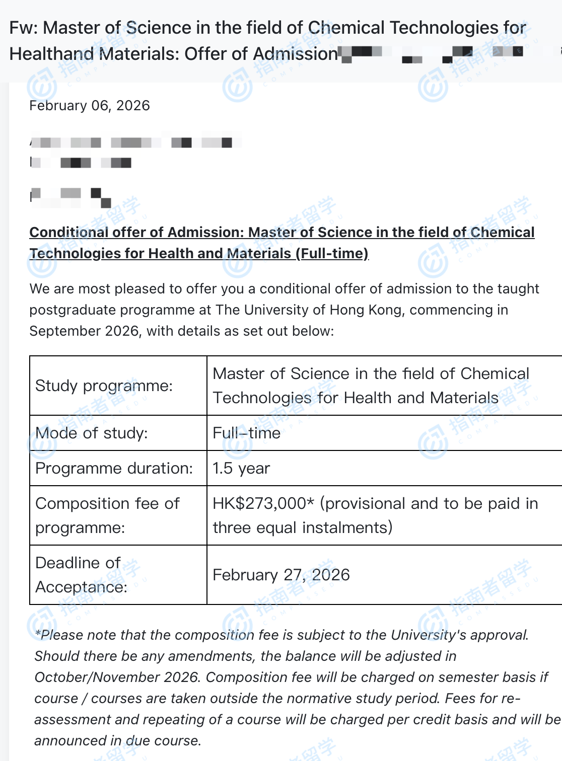 香港大学健康与材料化学技术理学硕士研究生offer一枚