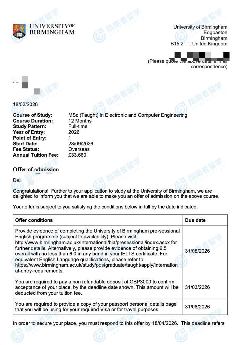 伯明翰大学电子与计算机工程理学硕士研究生offer一枚