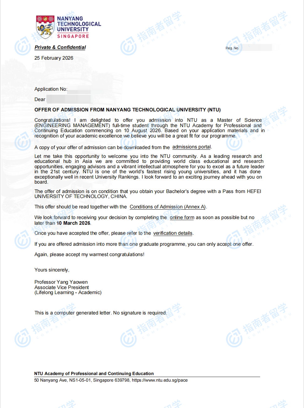 南洋理工大学工程管理理学硕士研究生offer一枚