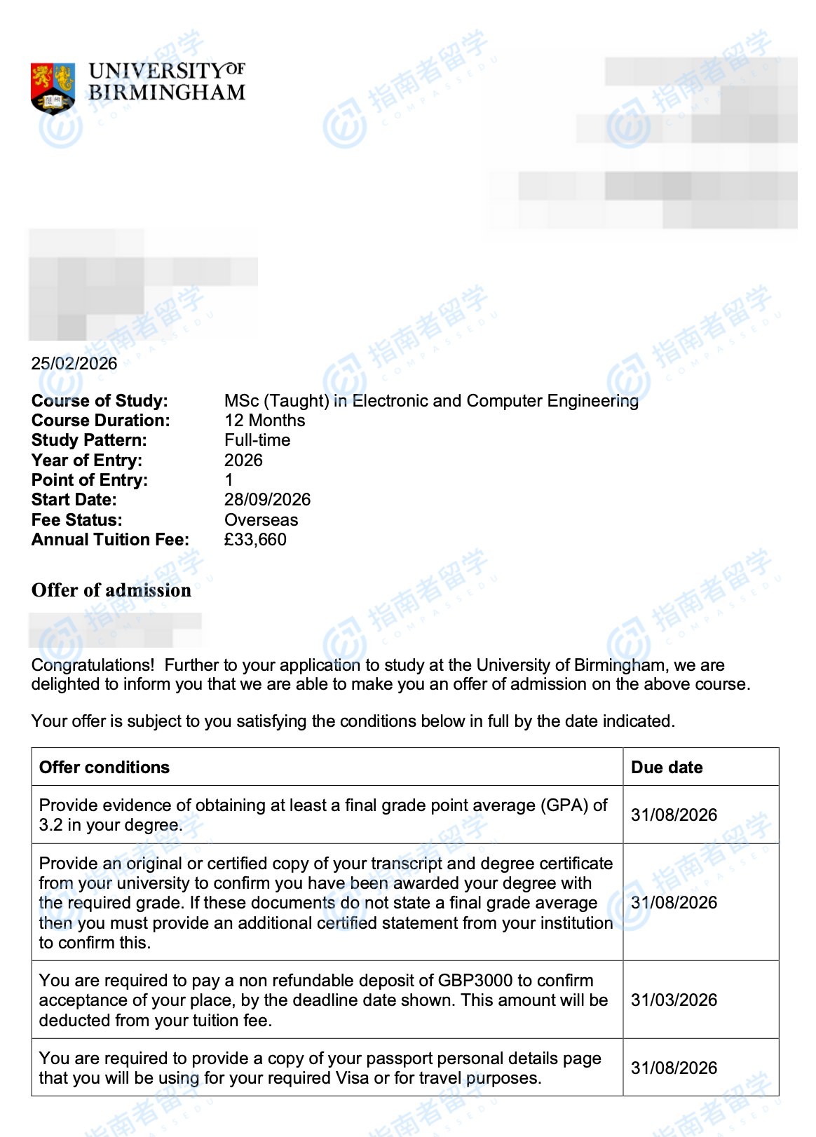伯明翰大学电子与计算机工程理学硕士研究生offer一枚