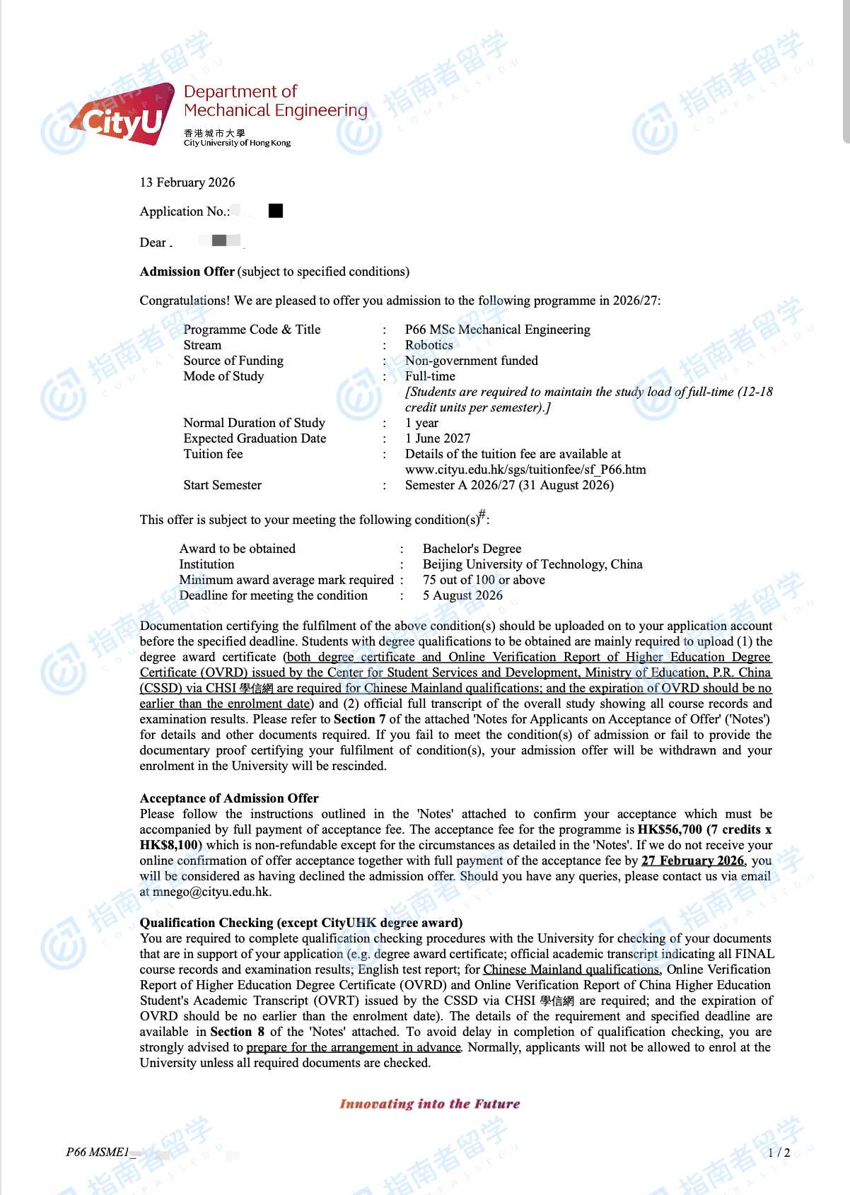 香港城市大学机械工程学理学硕士研究生offer一枚
