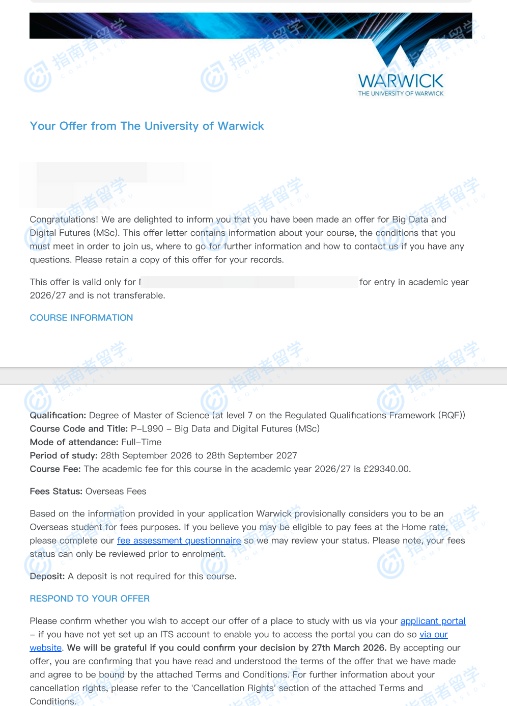 华威大学大数据与数字未来理学硕士研究生offer一枚