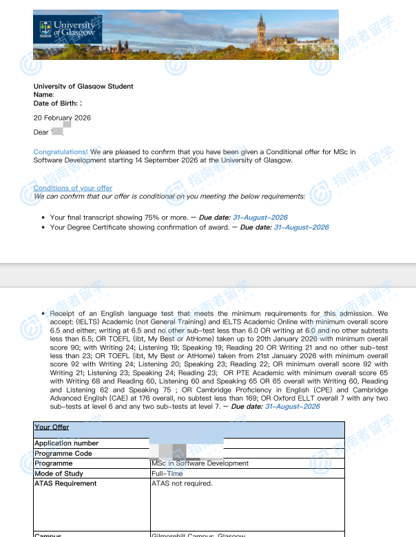 格拉斯哥大学软件开发理学硕士研究生offer一枚