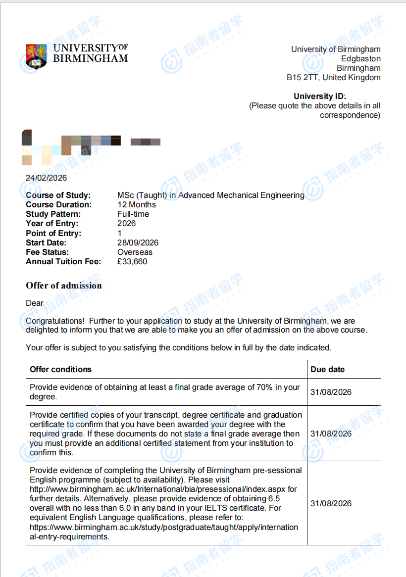伯明翰大学高级机械工程理学硕士研究生offer一枚