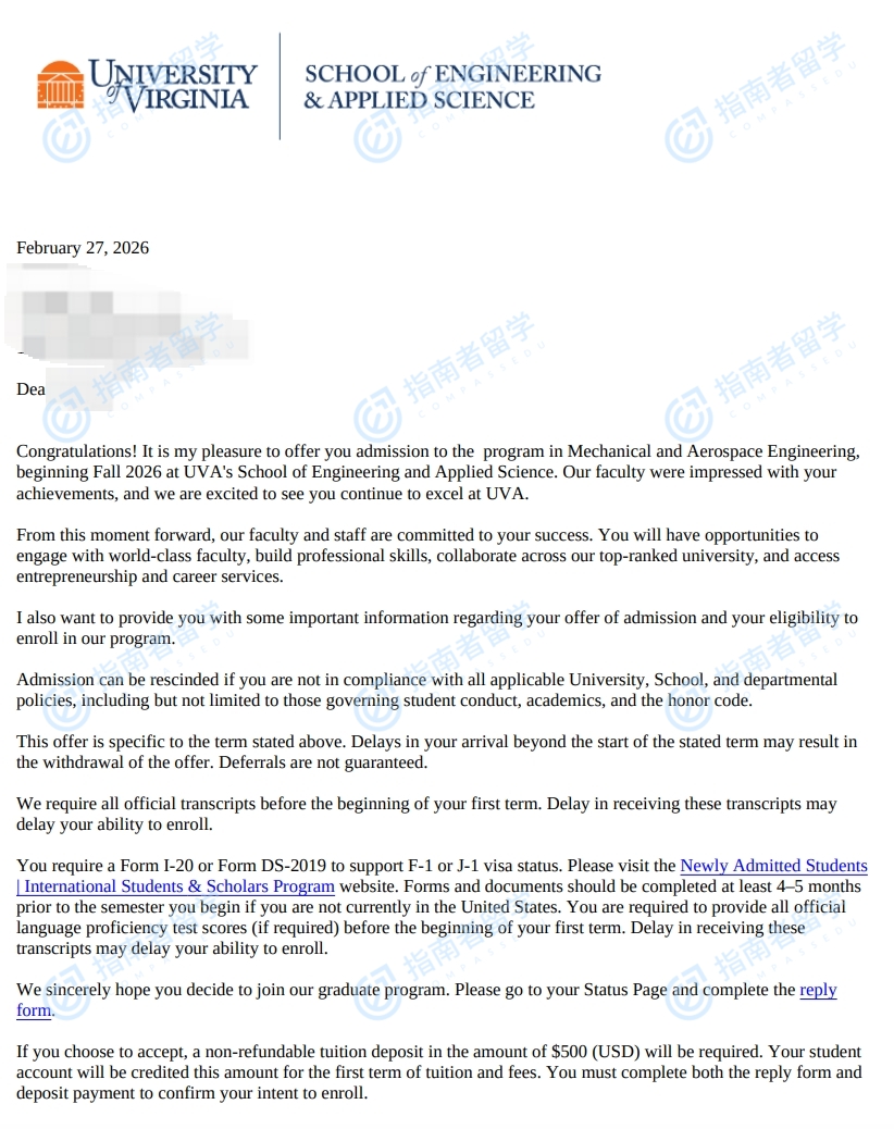 弗吉尼亚大学机械与航空航天工程硕士研究生offer一枚