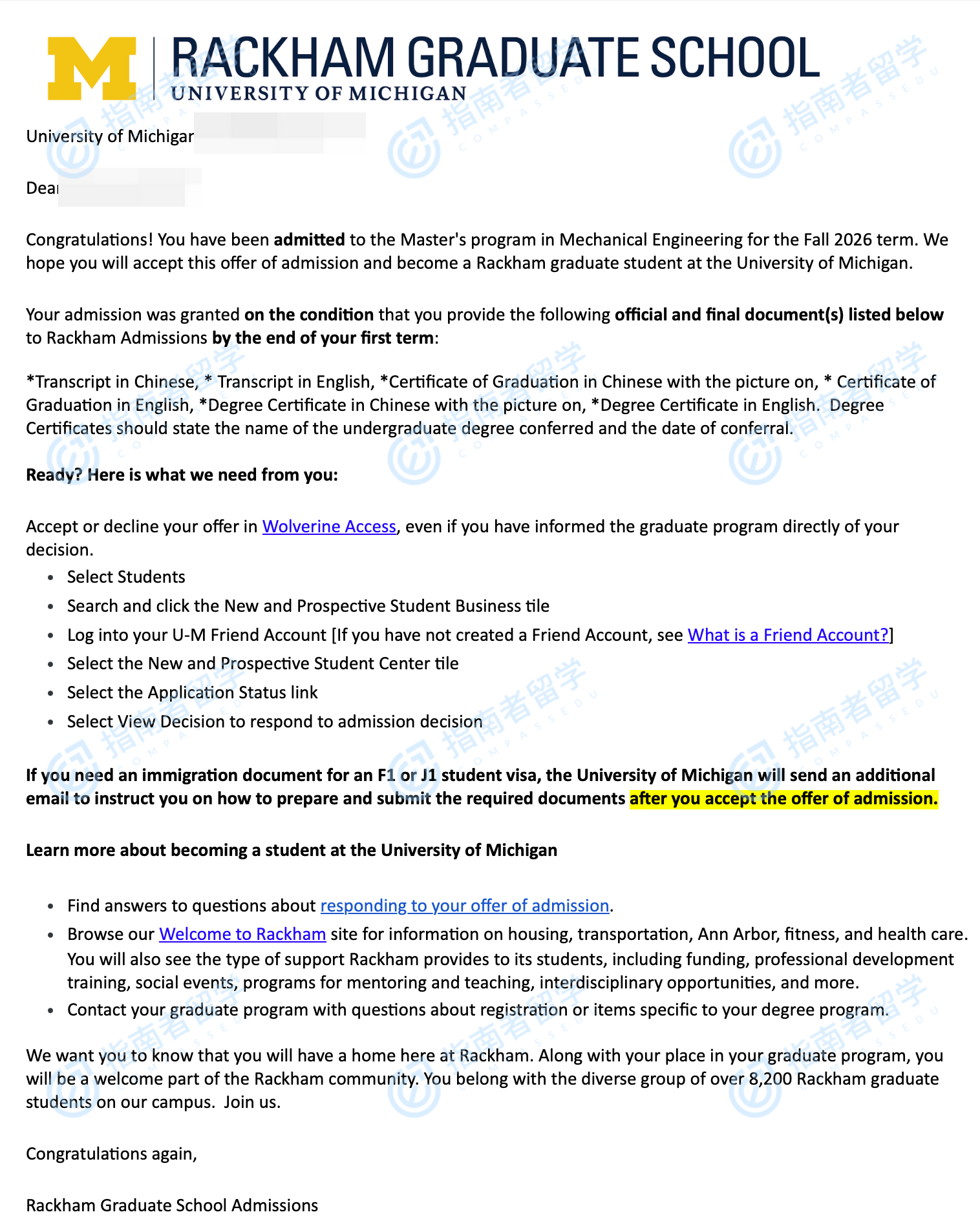 密歇根大学安娜堡分校机械工程理学硕士研究生offer一枚