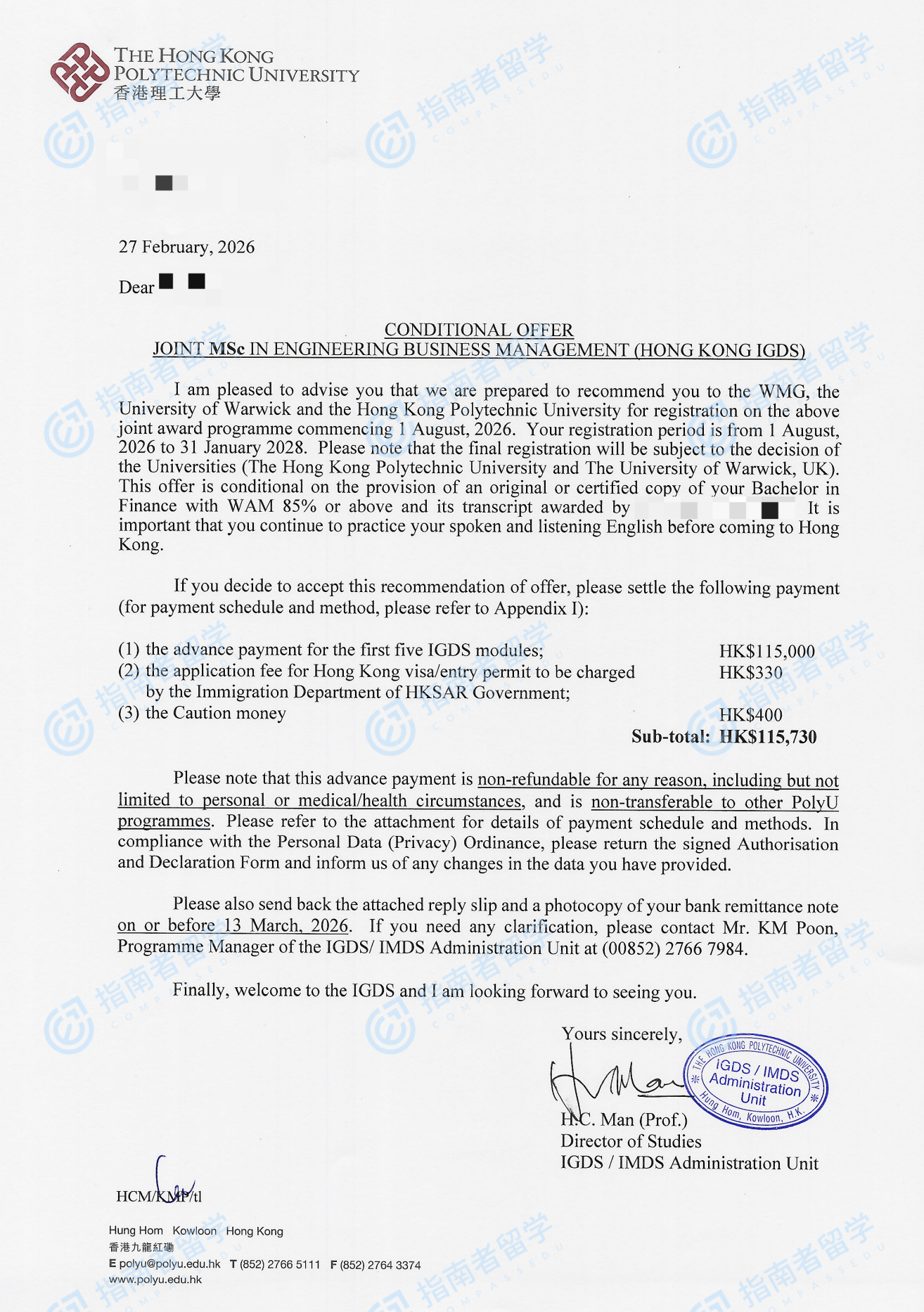 香港理工大学工程商业管理理学硕士研究生offer一枚