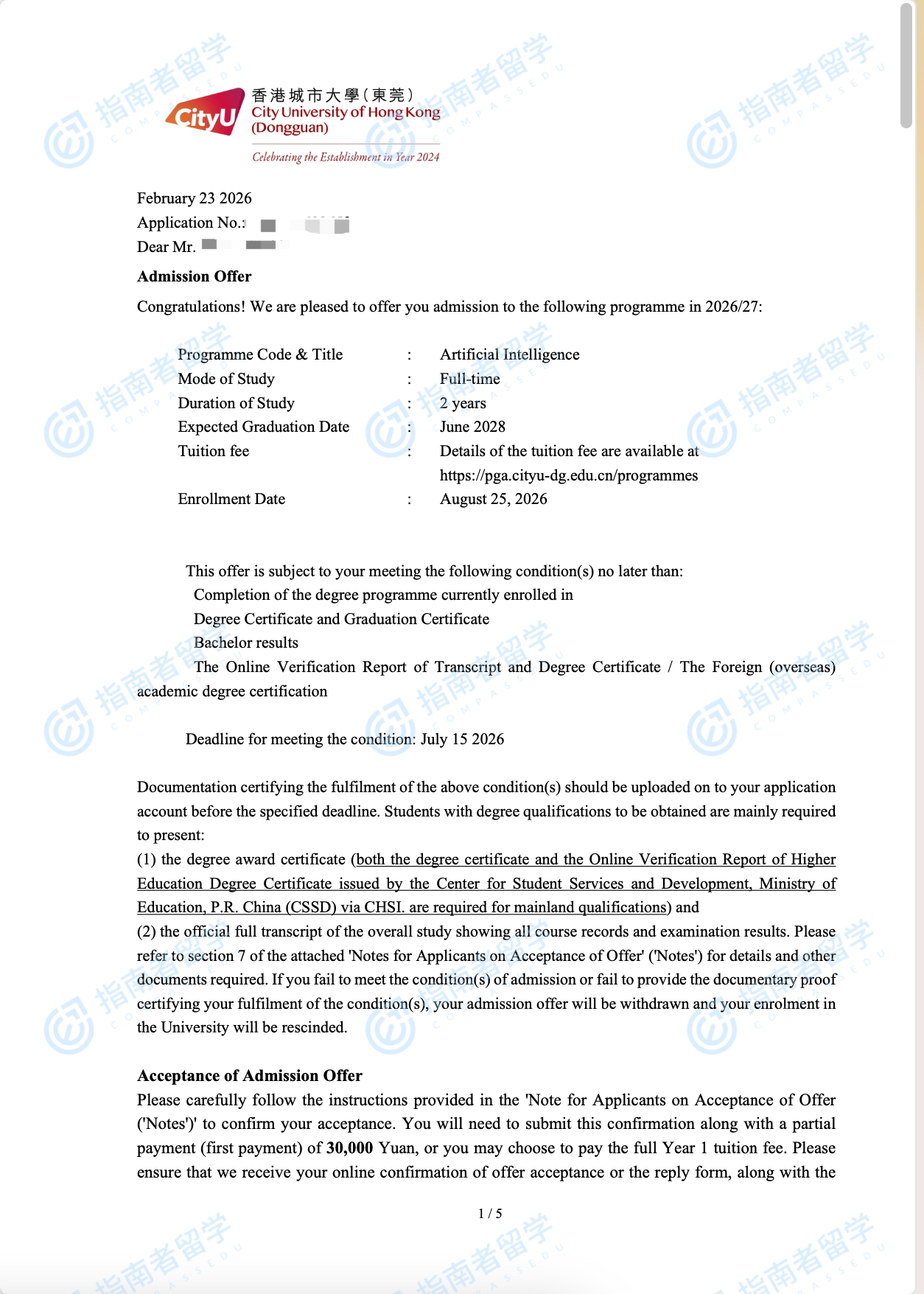 香港城市大学人工智能理学硕士(CityU-DG)研究生offer一枚