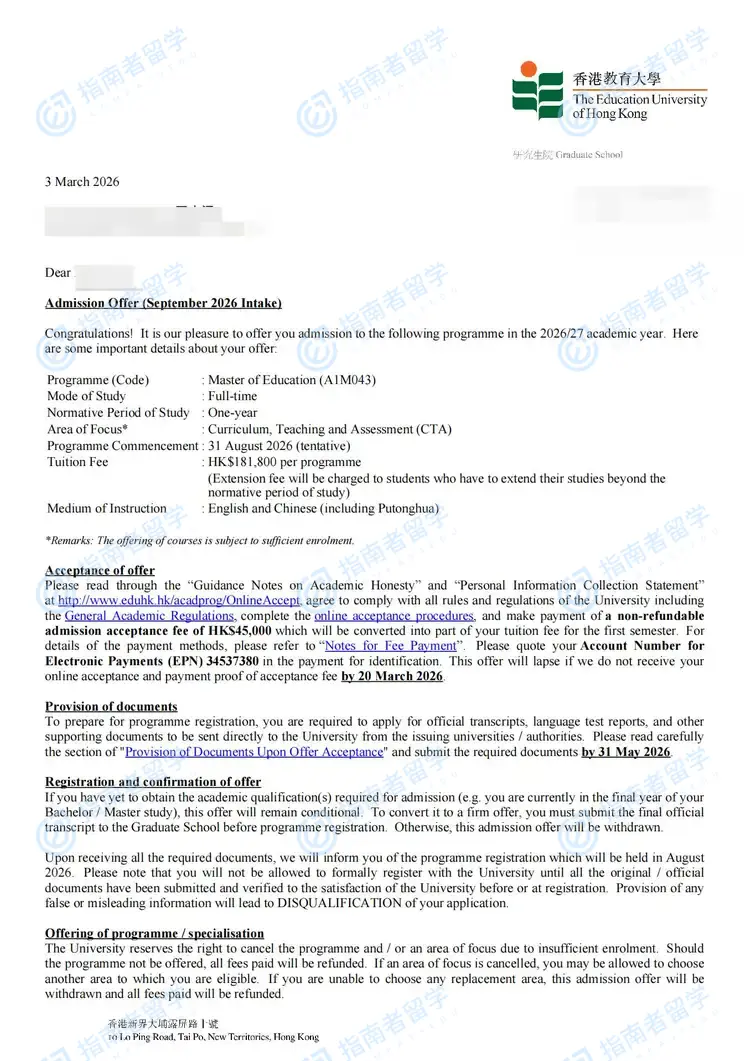 香港教育大学教育学硕士研究生offer一枚