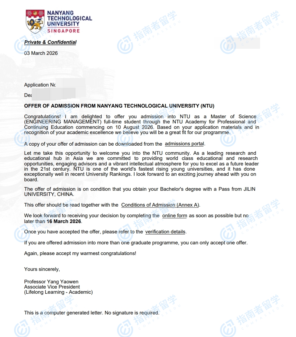 南洋理工大学工程管理理学硕士研究生offer一枚