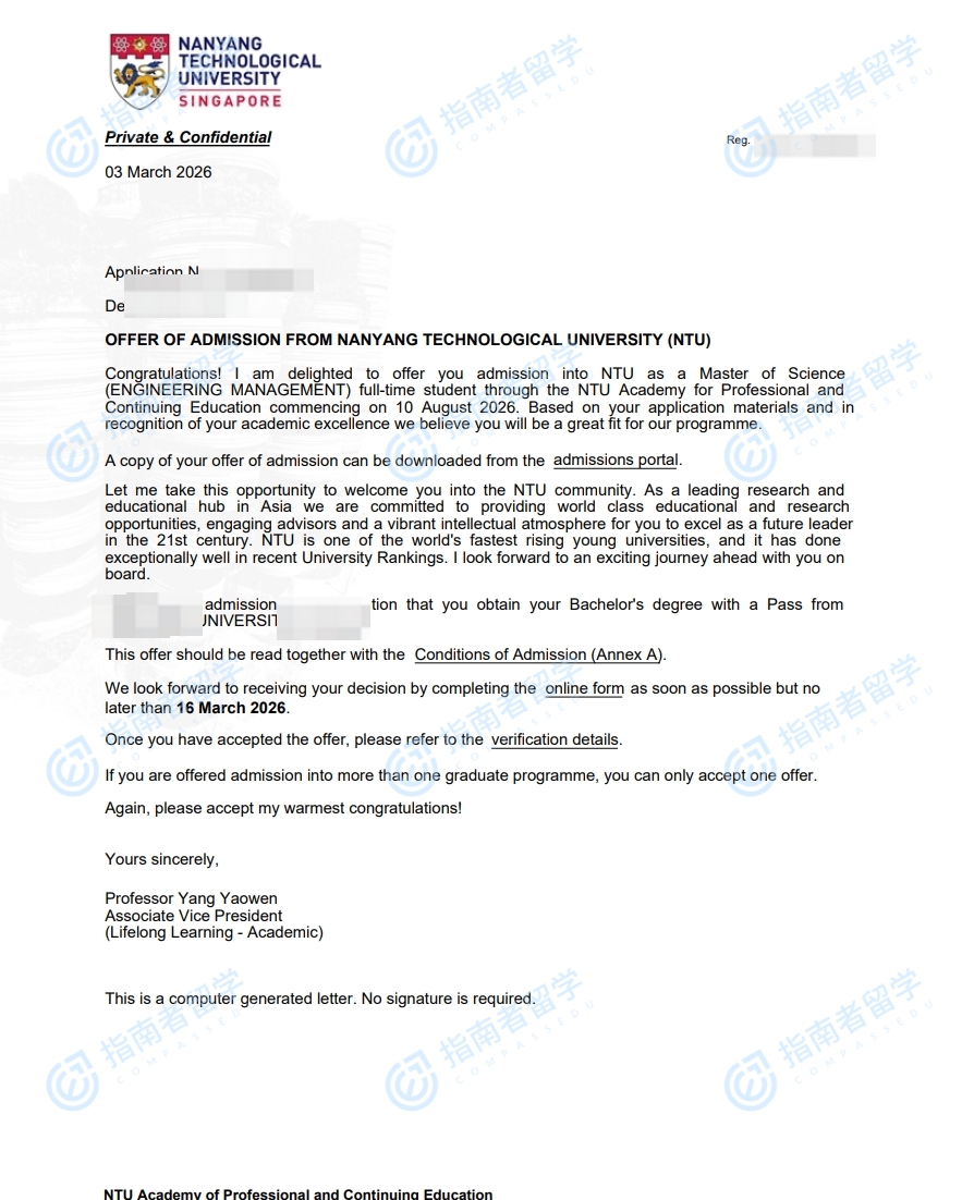 南洋理工大学工程管理理学硕士研究生offer一枚