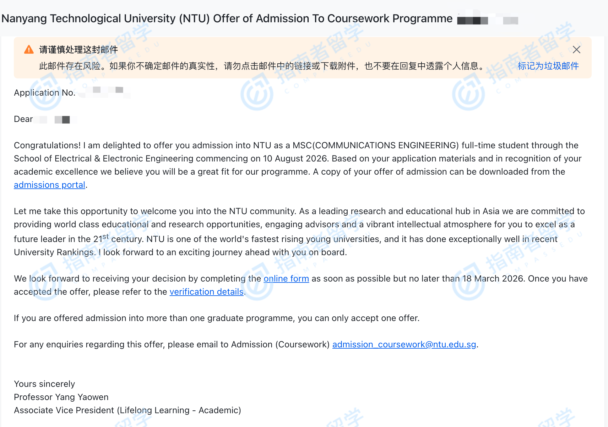 南洋理工大学通信工程理学硕士研究生offer一枚