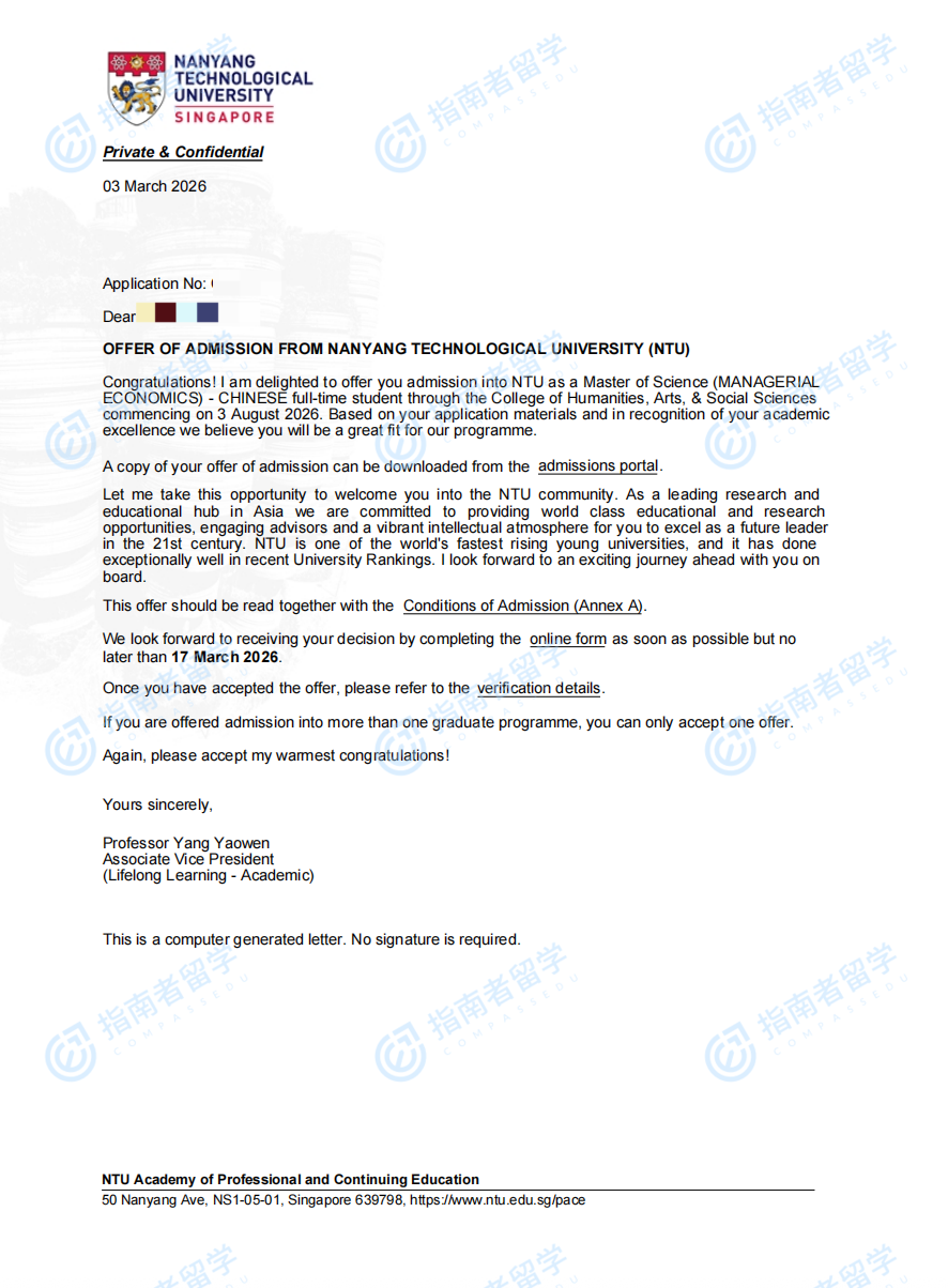 南洋理工大学管理经济学理学硕士(中文授课)研究生offer一枚