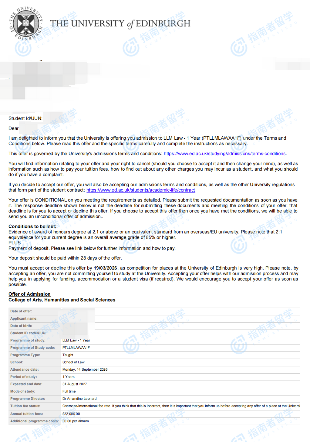 爱丁堡大学法学硕士研究生offer一枚