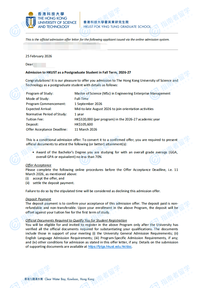 香港科技大学工程企业管理理学硕士研究生offer一枚