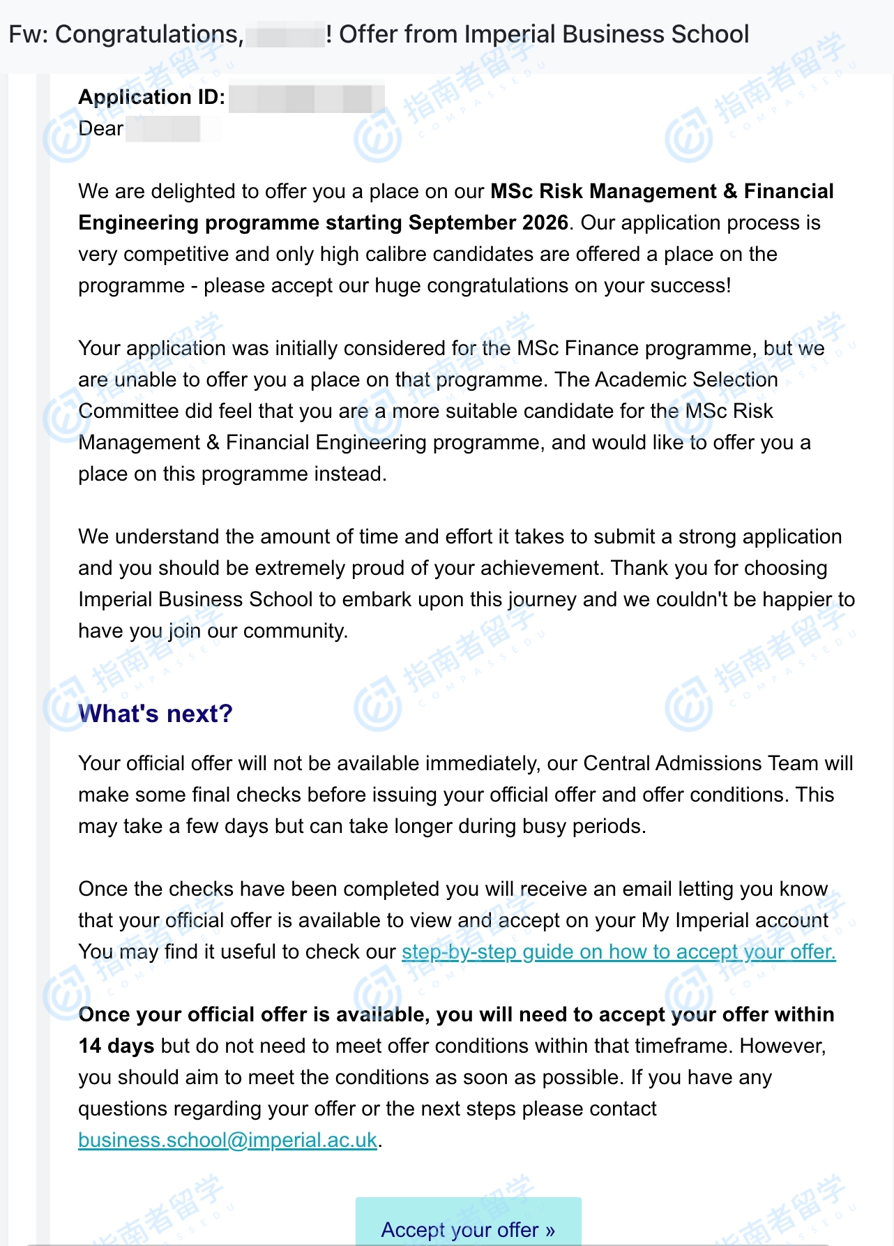 帝国理工学院风险管理与金融工程理学硕士研究生offer一枚