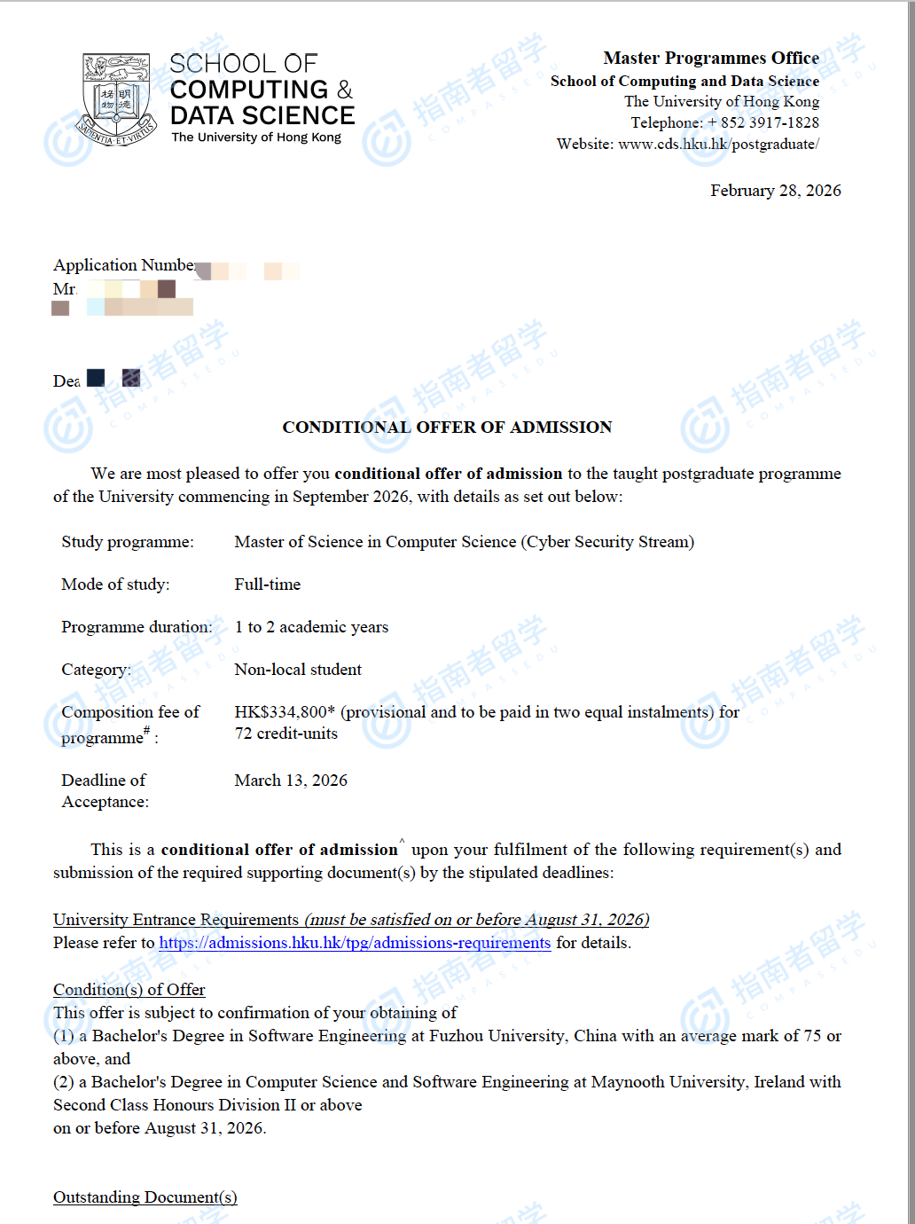 香港大学计算机科学理学硕士(网络安全方向)研究生offer一枚