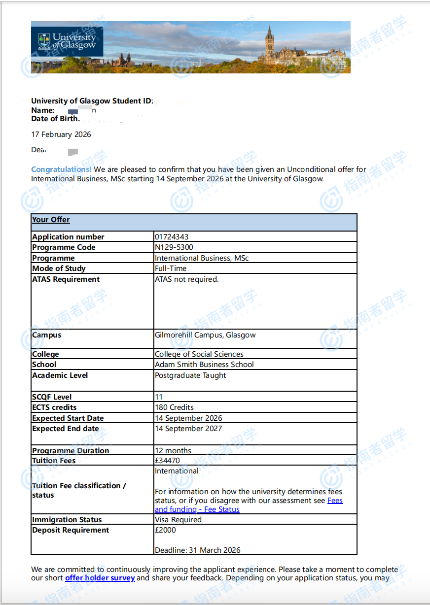 格拉斯哥大学国际商务理学硕士研究生offer一枚