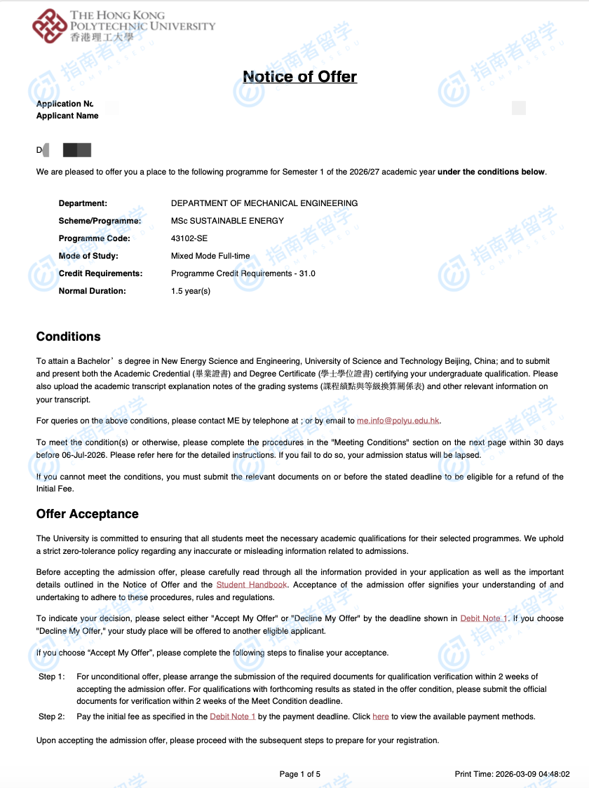 香港理工大学可持续能源理学硕士研究生offer一枚
