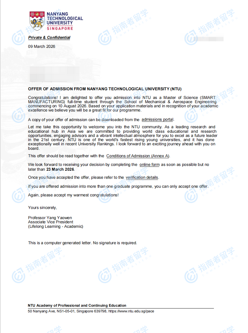 南洋理工大学智能制造理学硕士研究生offer一枚