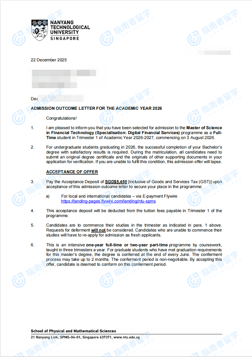 南洋理工大学金融科技理学硕士(数字金融服务)研究生offer一枚