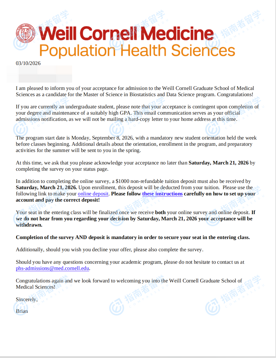 康奈尔大学生物统计学与数据科学硕士研究生offer一枚