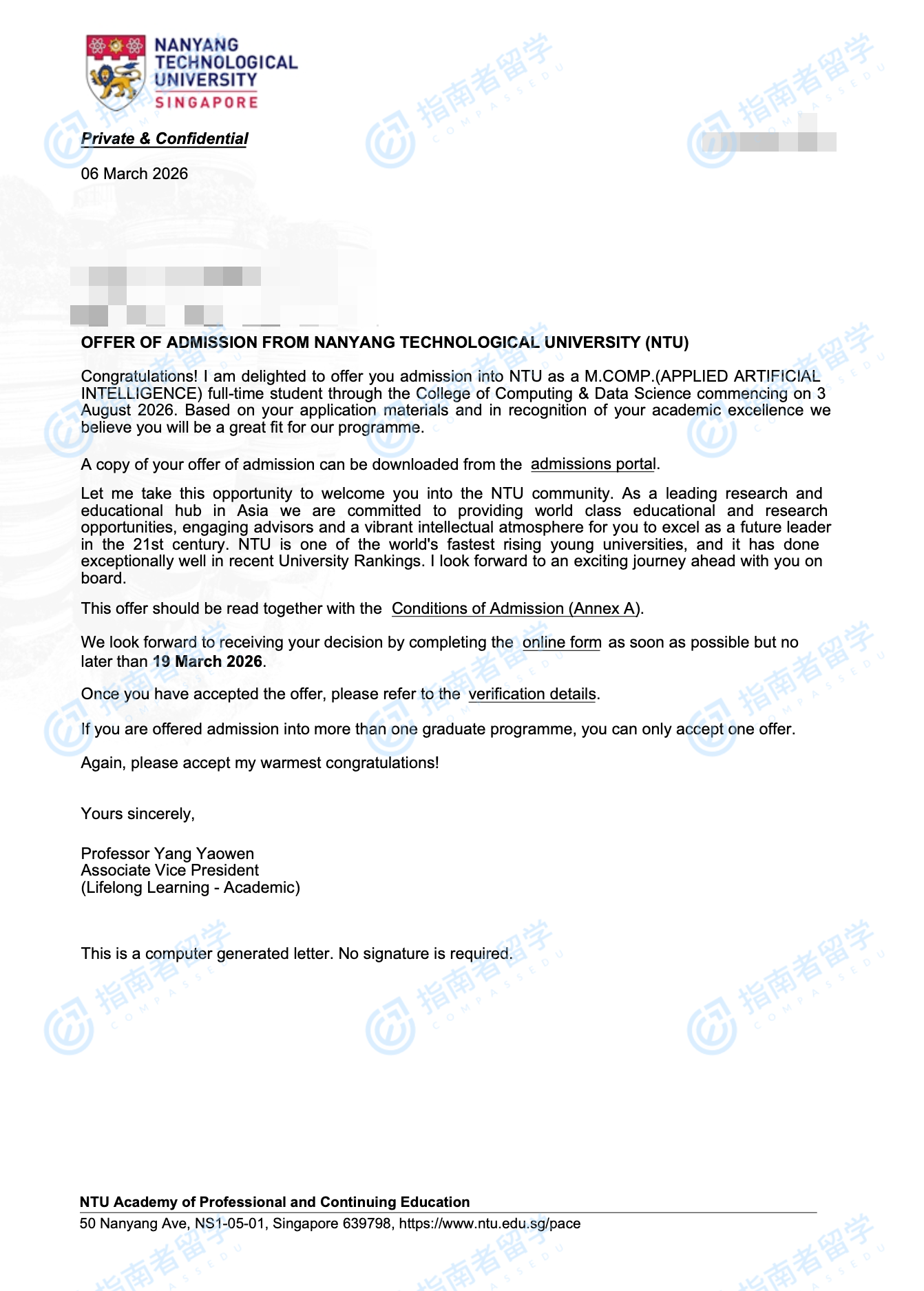 南洋理工大学应用人工智能计算硕士研究生offer一枚