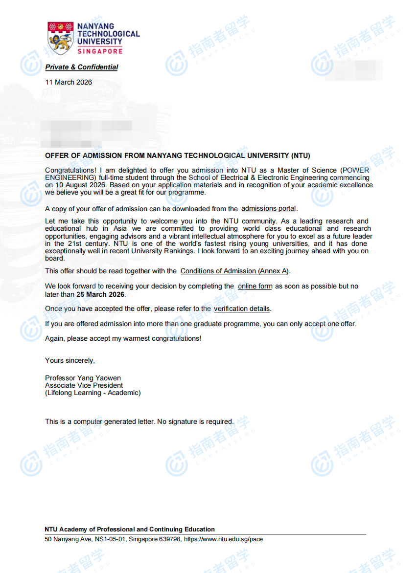 南洋理工大学电力工程理学硕士研究生offer一枚