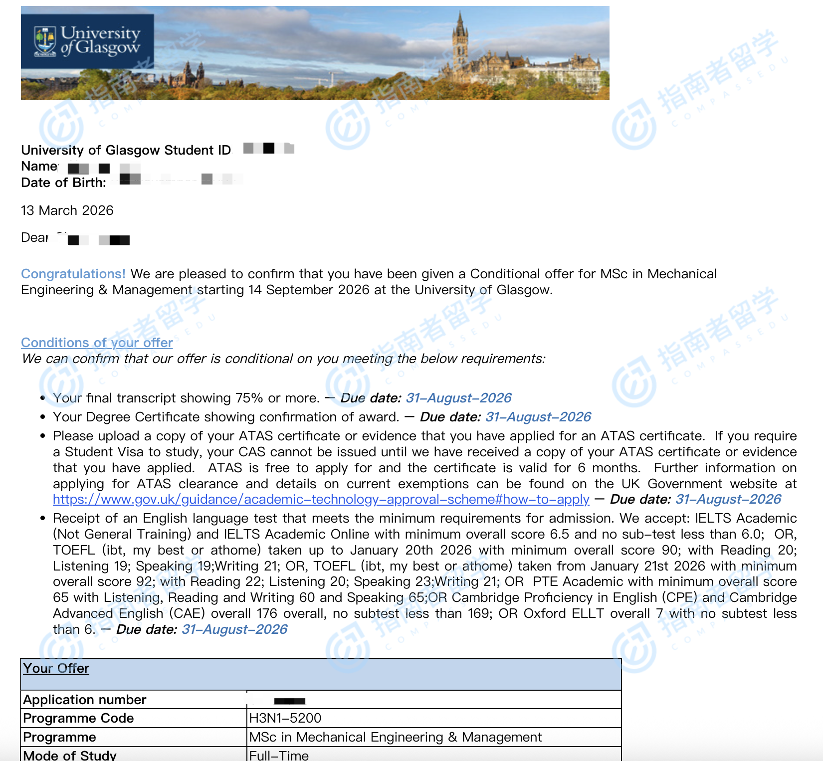 格拉斯哥大学机械工程与管理理学硕士研究生offer一枚