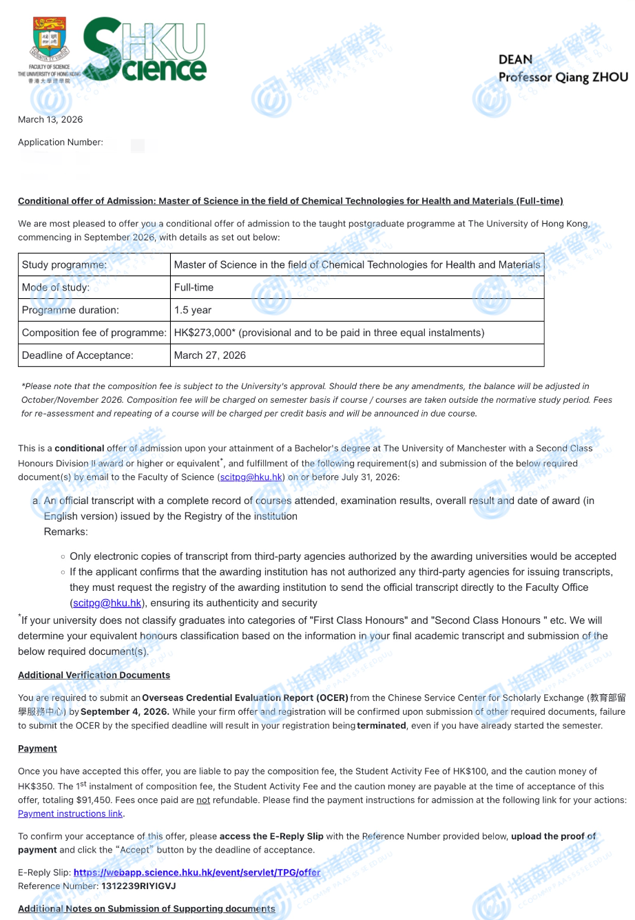香港大学健康与材料化学技术理学硕士研究生offer一枚