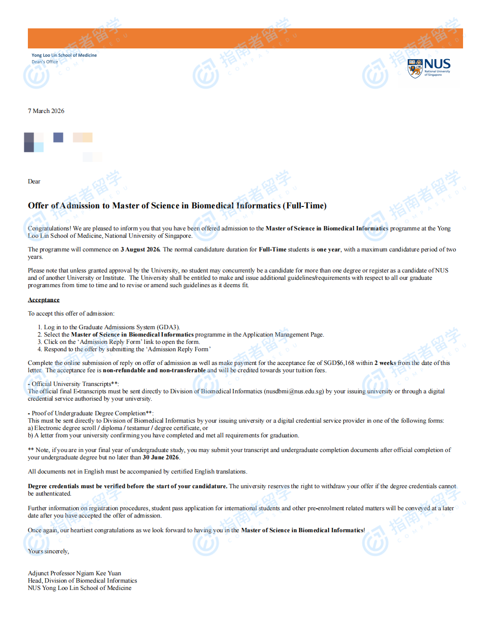 新加坡国立大学生物医学信息学理学硕士研究生offer一枚