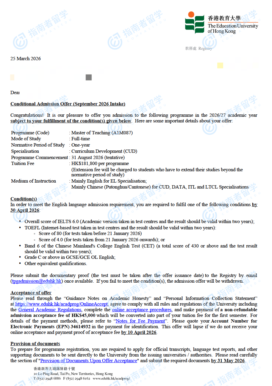 香港教育大学教学硕士研究生offer一枚