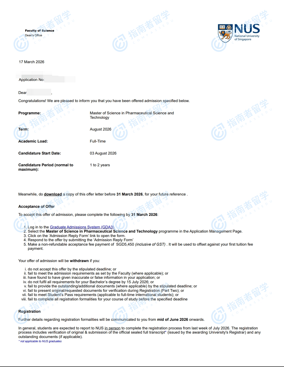 新加坡国立大学制药科学与技术理学硕士研究生offer一枚