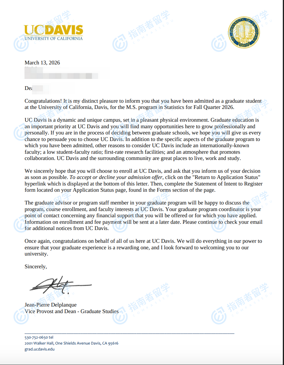 加州大学戴维斯分校统计学硕士研究生offer一枚