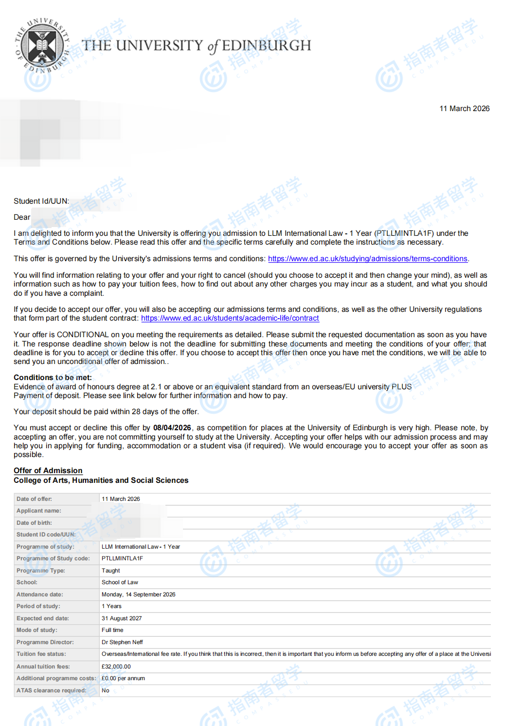 爱丁堡大学法学硕士研究生offer一枚