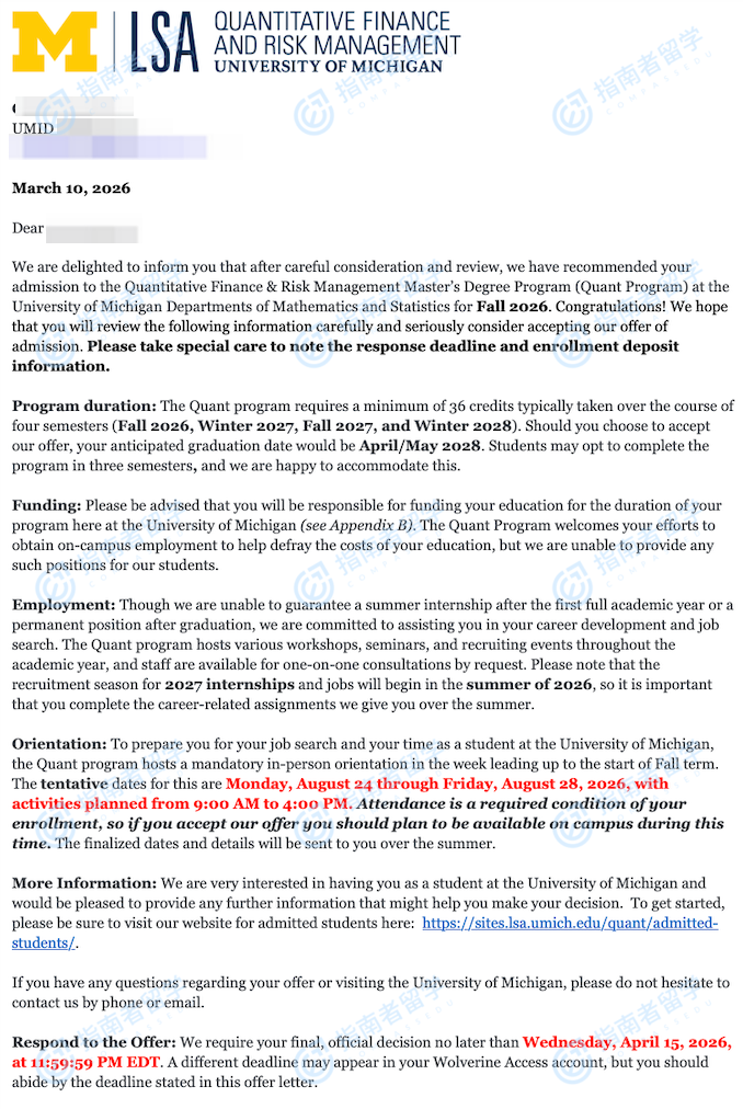 密歇根大学安娜堡分校定量金融与风险管理硕士研究生offer一枚