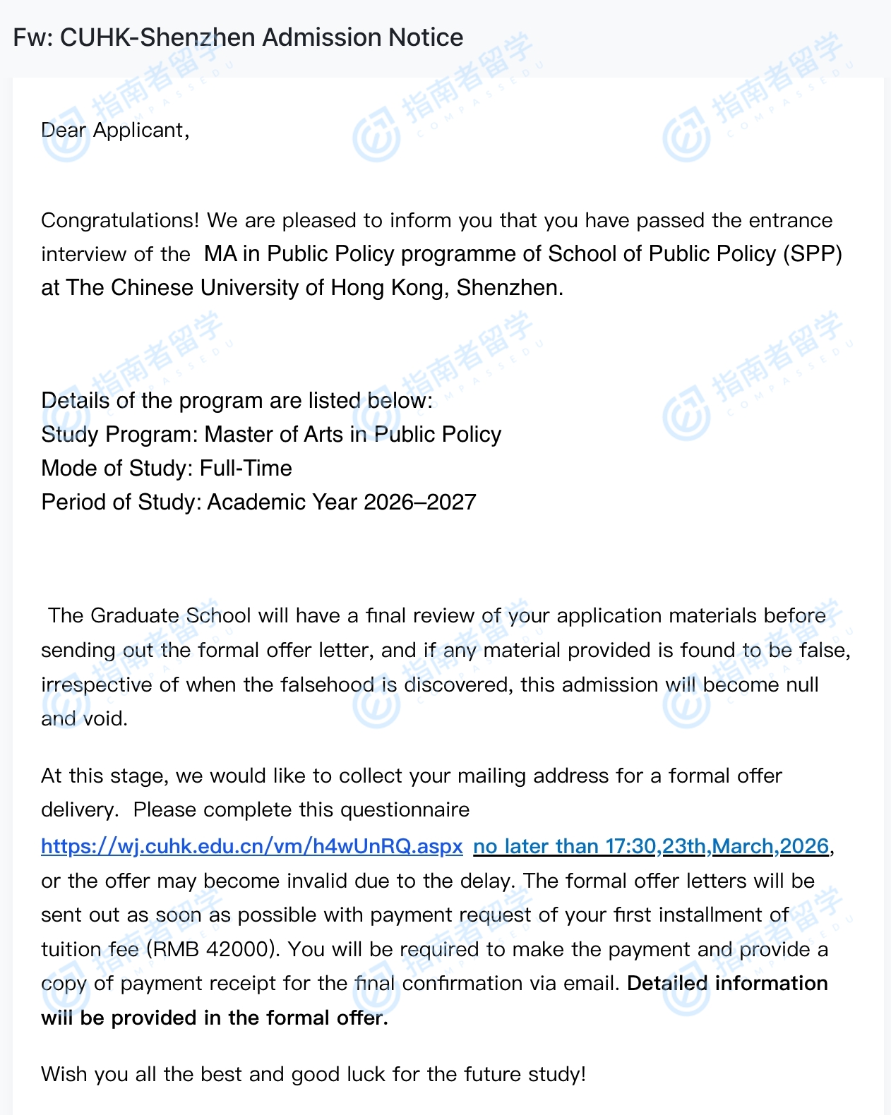 香港中文大学公共政策文学硕士(CUHK-Shenzhen)研究生offer一枚