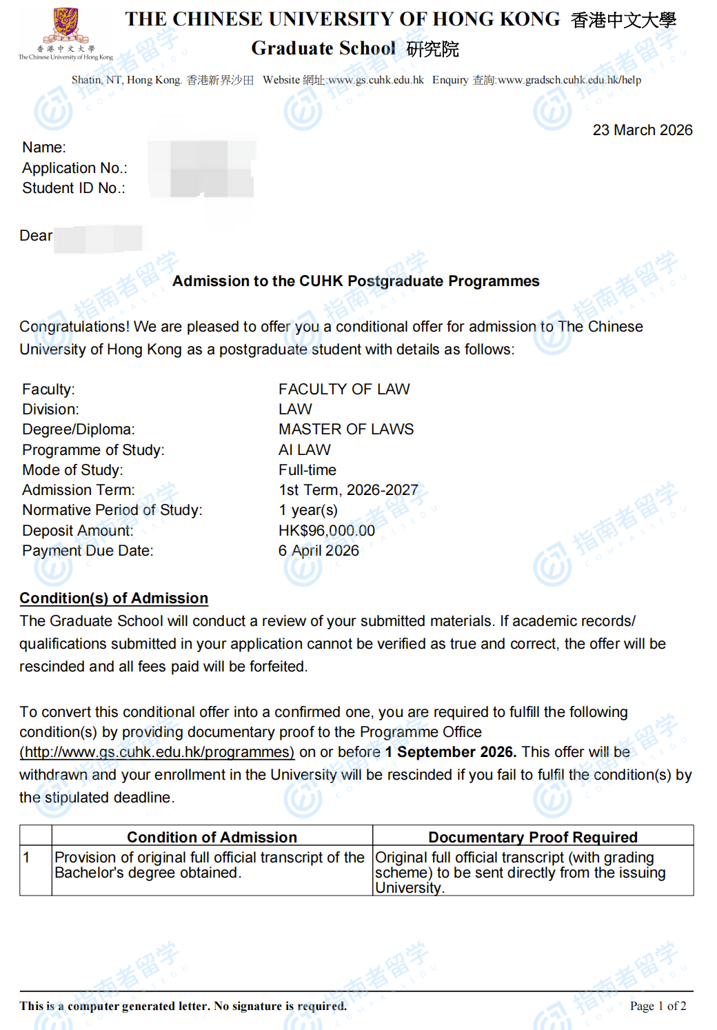 香港中文大学人工智能法法学硕士研究生offer一枚