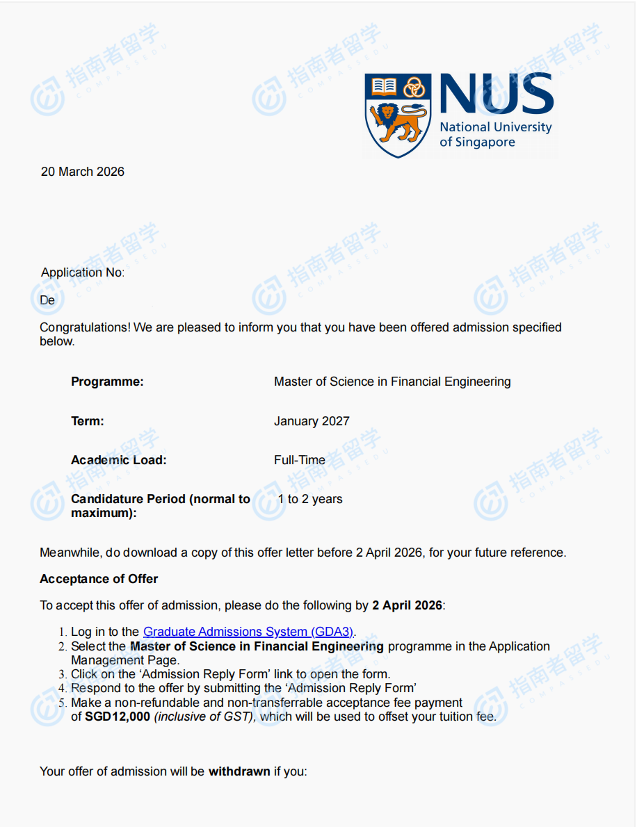 新加坡国立大学金融工程理学硕士研究生offer一枚