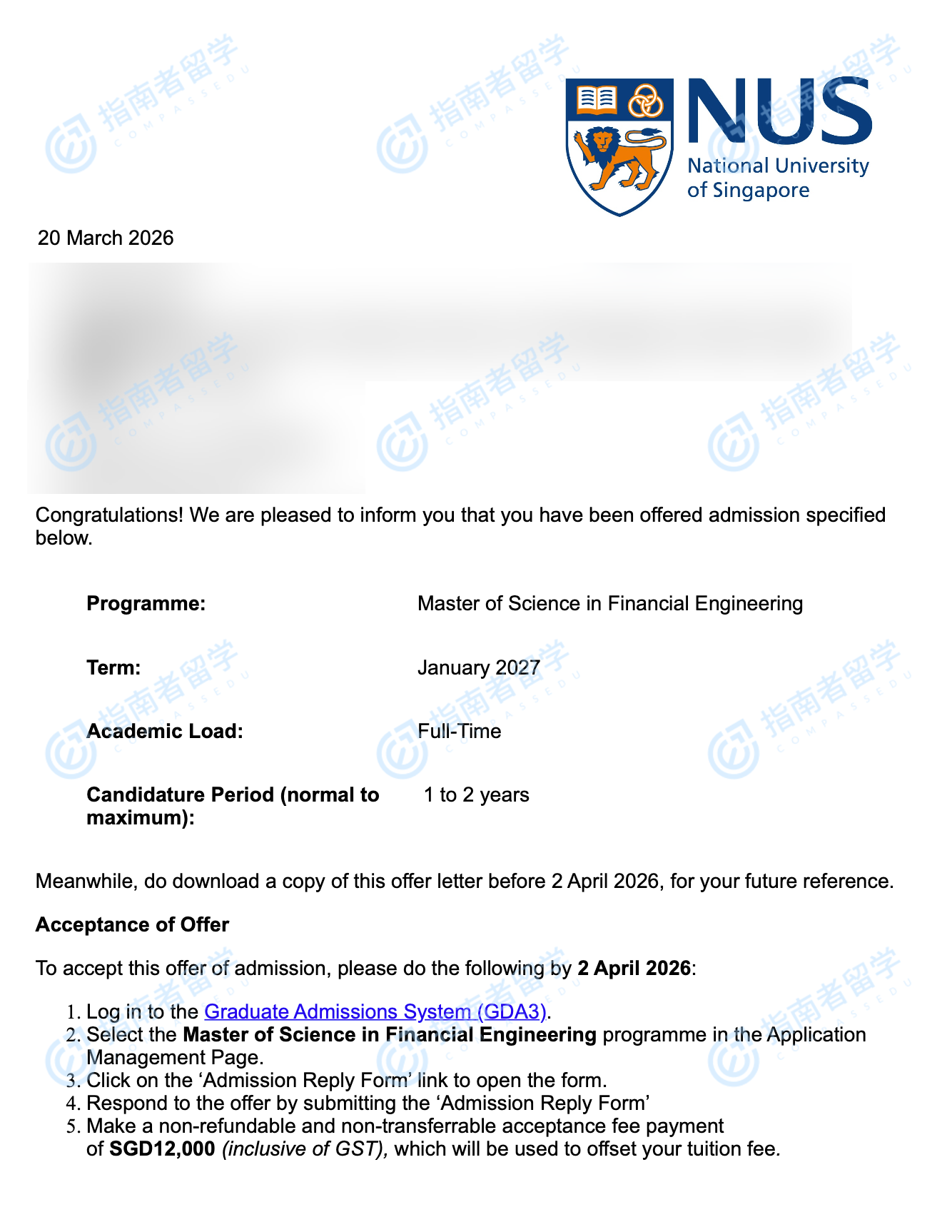 新加坡国立大学金融工程理学硕士研究生offer一枚