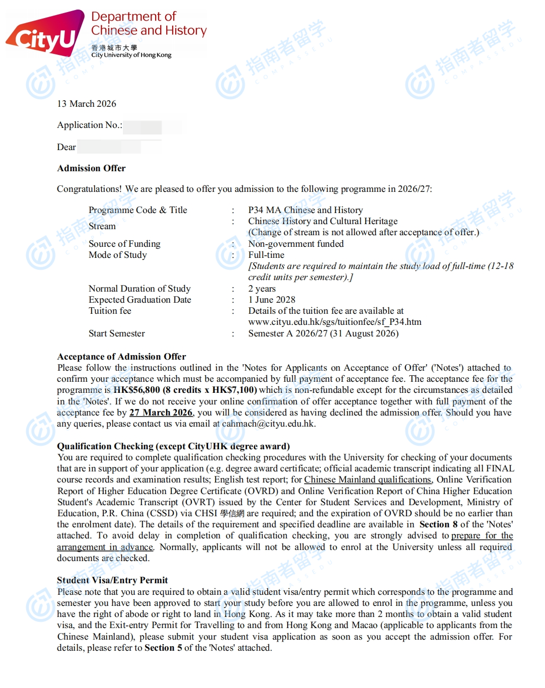 香港城市大学中国语言文学与历史文学硕士研究生offer一枚