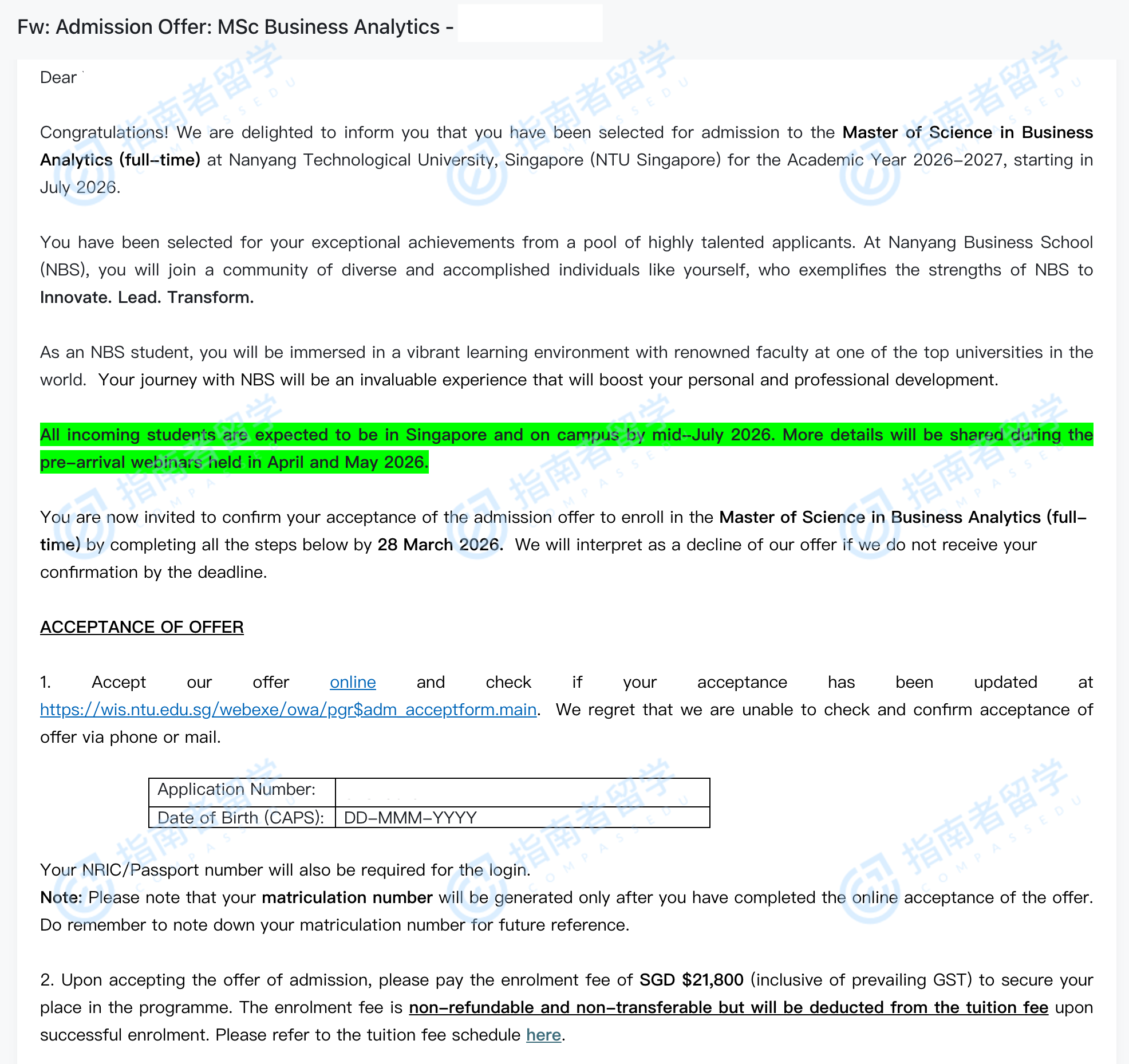 南洋理工大学商业分析理学硕士研究生offer一枚