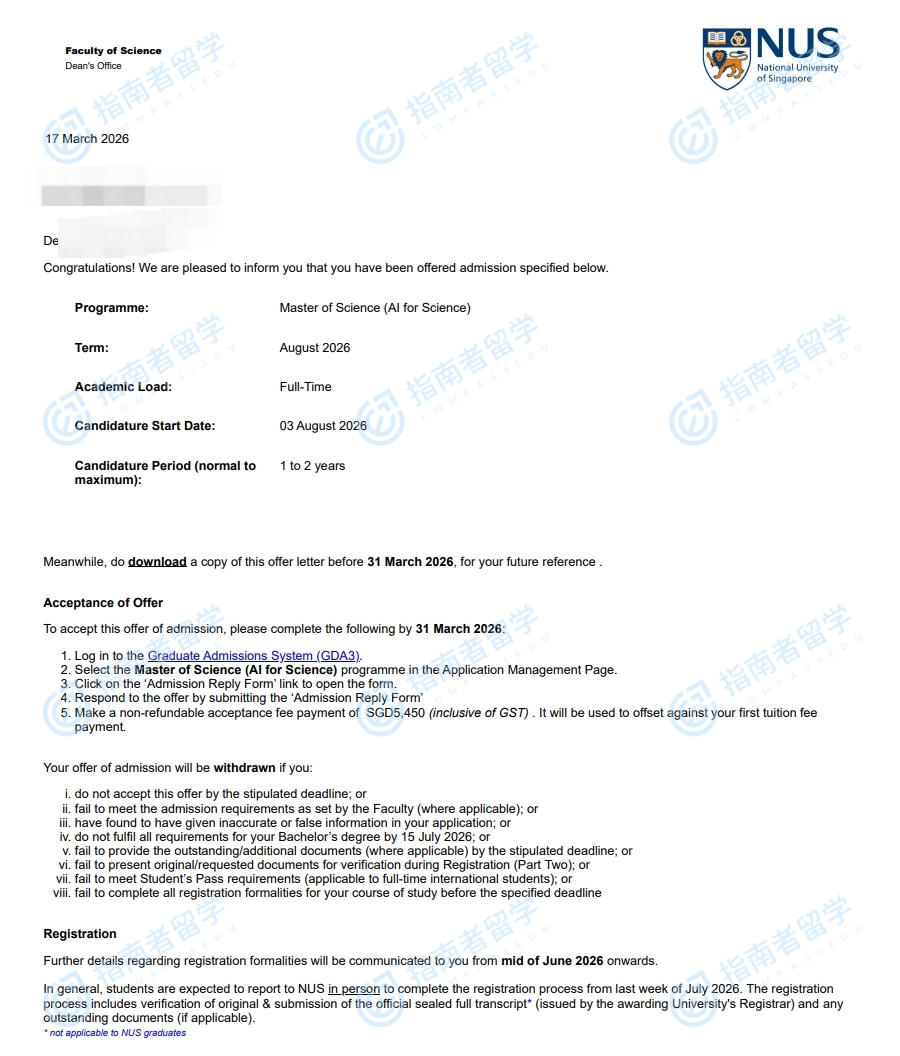 新加坡国立大学科学智能理学硕士研究生offer一枚