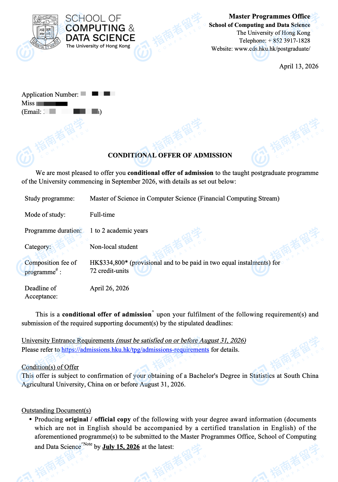 香港大学计算机科学理学硕士(金融计算方向)研究生offer一枚