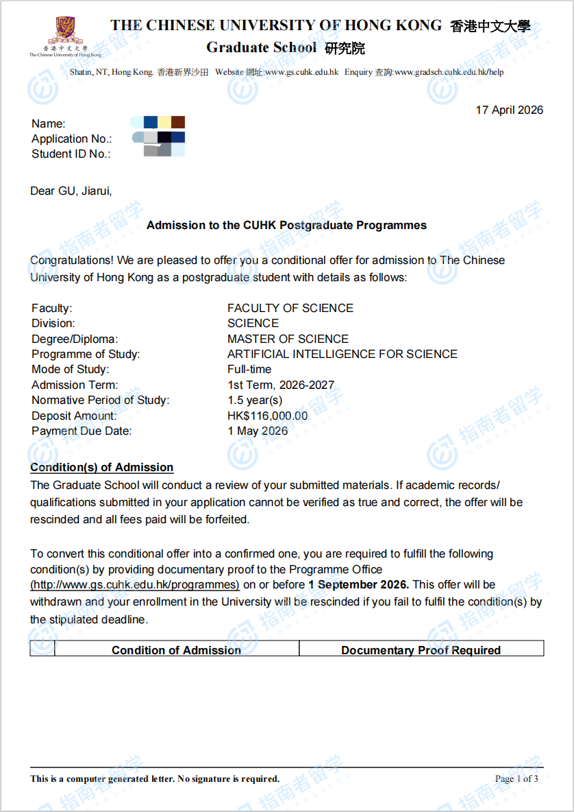 香港中文大学人工智能科学理学硕士研究生offer一枚